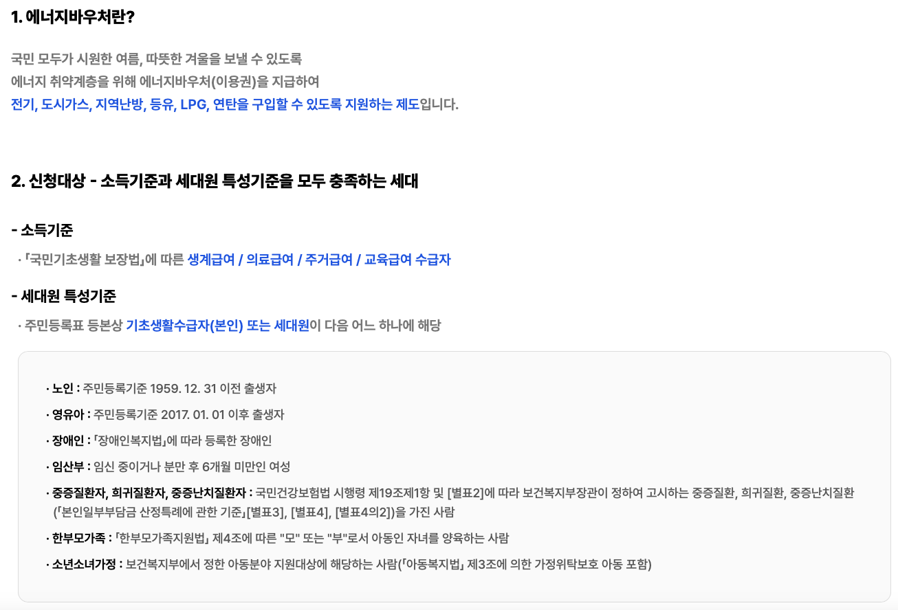 - 신청 방법: 주민센터 방문 또는 에너지 바우처 홈페이지에서 신청.