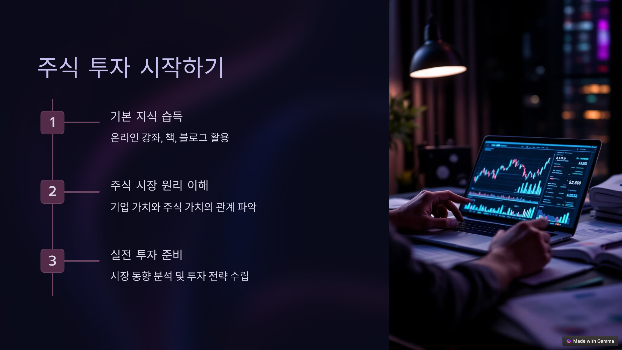 주식 시장의 기본적인 원리를 이해하는 것부터 시작해야 합니다. 주식은 기업의 일부를 소유하는 것으로, 그 기업이 잘되면 주식의 가치도 올라가고, 기업이 어려워지면 주식의 가치는 떨어집니다. 이러한 기본 개념을 이해하면 주식 시장에 대한 두려움을 줄일 수 있습니다.