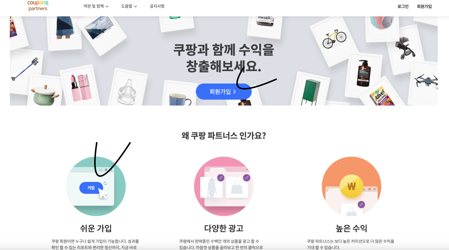 쿠팡 파트너스로 수익을 창출하려면 먼저 회원 가입을 해야 합니다.
