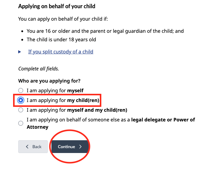 자녀를 위한 신청 버튼을 클릭후 계속하기버튼 눌러주세요