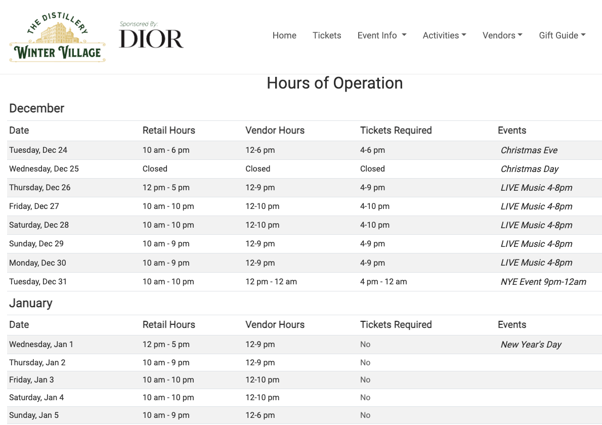 스틸러리 윈터 빌리지는 유럽 전통 축제의 축소판으로 불리며, 현지 음식, 크리스마스 캐럴, 플리마켓 등 다양한 즐길 거리를 선사하여 연말 분위기를 물씬 느낄 수 있는 행사로 자리매김하고 있습니다. 크리스마스이브 때는 4-6시까지 운영하며 크리스마스 때는 문을 닫습니다. ) 4시 전입장은 무료입니다.