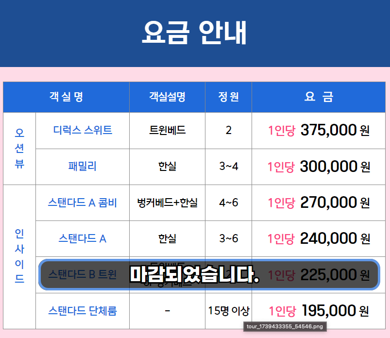 - 1인당 19만 5000원~37만 5000원 (객실 등급별 상이)