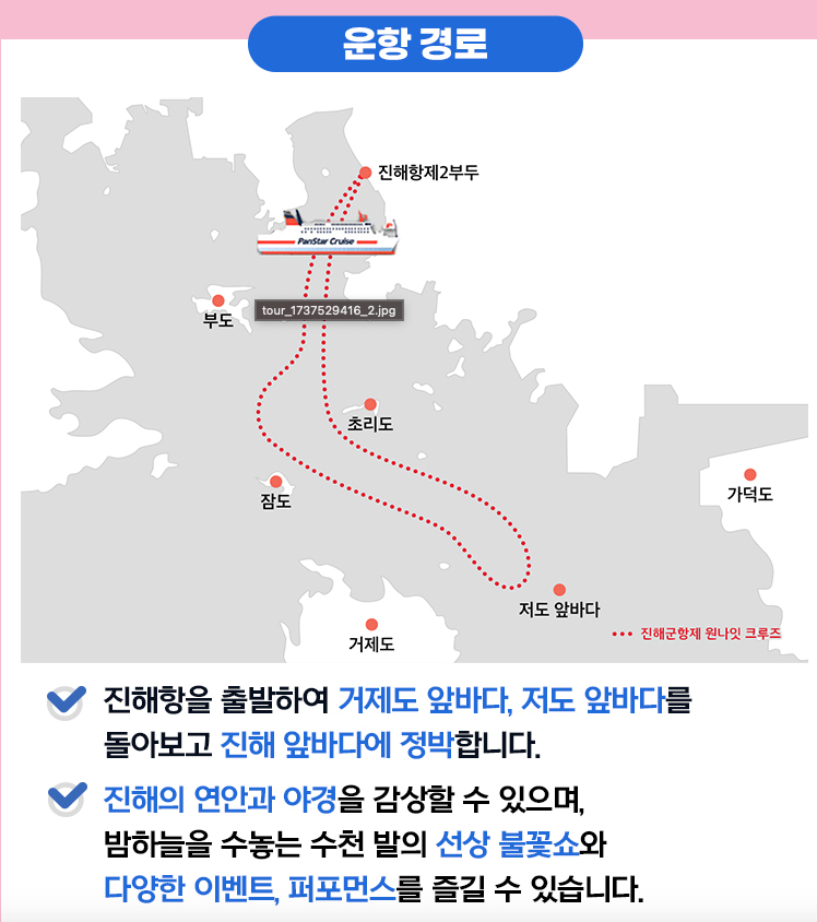 2025년 진해군항제(3월 29일~4월 6일 예정)에서는 숙박형 크루즈를 이용해 바다 위에서 벚꽃을 감상할 수 있습니다. 올해도 **팬스타드림호(2만 2000톤급)**가 운항될 예정이며, 1박 2일 동안 진해항 제2부두에서 출발하여 진해 앞바다와 저도 일대를 순항합니다.