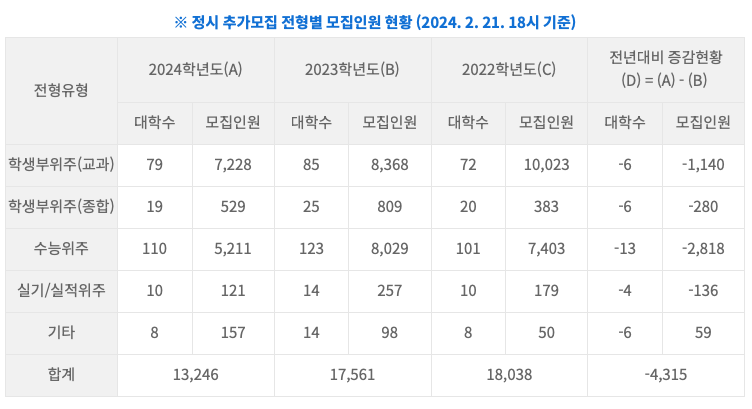 2024년 정시 추가 모집은 2월 22일부터 2월 29일까지 진행하였고, 총 152개 대학에서 13,246명의 인원을 추가 모집했습니다.. 이는 지난해에 비해 약 4,000명 이상 감소한 수치입니다. 추가 모집은 주로 최초 합격을 취소하거나 등록을 포기한 학생들을 위한 모집입니다.