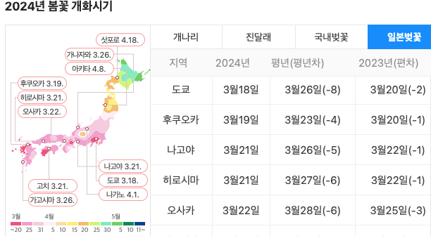 - 도쿄: 개화 - 3월 24일 / 만개 - 4월 1일